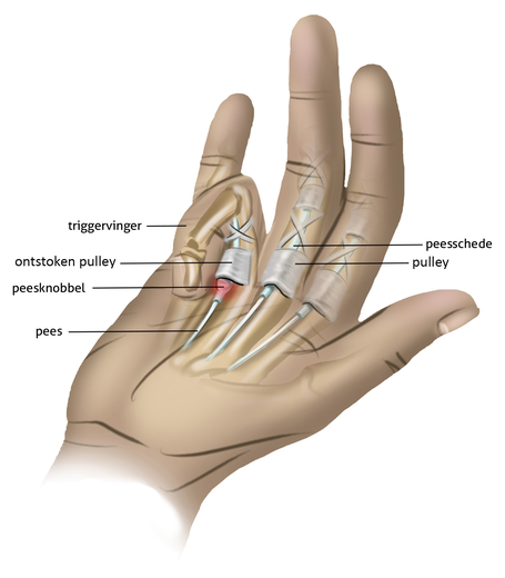 Als een vinger of een duim tijdens het buigen gaat vastzitten en daarna weer los schiet, spreken we van een ’trigger finger’. De buigpees kan niet goed meer glijden in de peeskoker (de huls waar de pees doorheen glijdt).