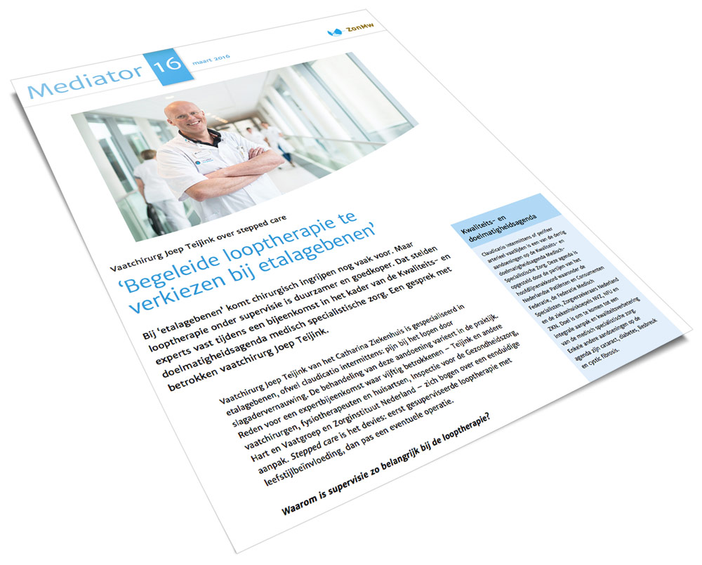 Uit het onderzoek blijkt dat een Stepped Care traject de beste behandelvorm is voor patiënten met etalagebenen terwijl in de praktijk nog te vaak voor een dotterbehandeling wordt gekozen. Bij zo’n behandeling, die door een vaatchirurg in het ziekenhuis wordt uitgevoerd, wordt de vernauwing in het bloedvat met een ballonnetje weggedrukt. Een Stepped Care traject is gericht op het toenemen van bewegen en het verbeteren van de leefstijl. Prof. dr. Joep Teijink, vaatchirurg in het Catharina Hart & vaatcentrum, legt in Mediator uit waarom begeleide looptherapie te verkiezen is boven een dotterbehandeling.