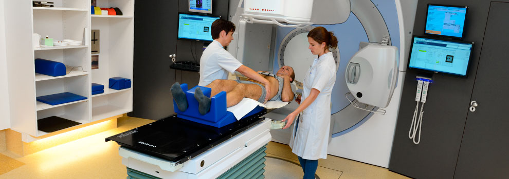 - De laboranten zorgen ervoor dat u precies hetzelfde ligt als op de CT-scan. Zij stellen nauwkeurig in en gebruiken hiervoor de gegevens van het bestralingsplan.