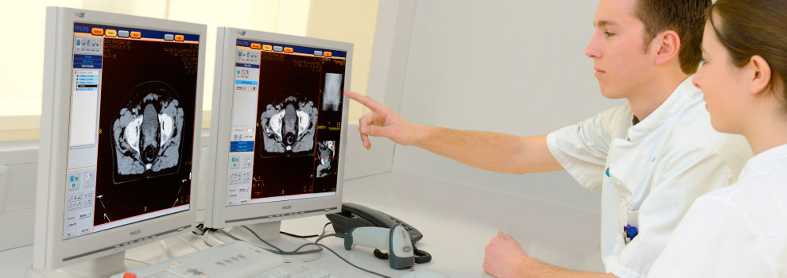 - Bepaling van het te bestralen gebied met behulp van de CT scan met volle blaas.