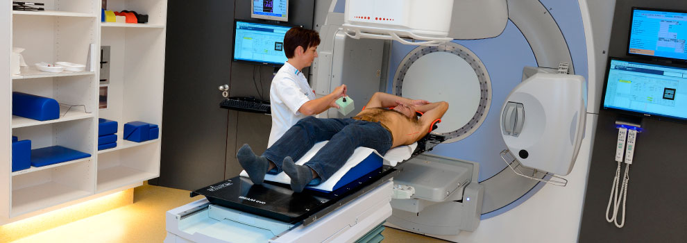- De laboranten zorgen ervoor dat u precies hetzelfde ligt als op de CT-scan. Zij stellen nauwkeurig in en gebruiken hiervoor de gegevens van het bestralingsplan.