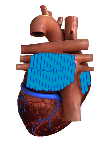 De chirurg opent vervolgens uw hartzakje, dit is een vliesachtig zakje dat het hart omsluit. Door het openen van het hartzakje kan de chirurg naar het gebied van de longaderen gaan. In dit gebied ontstaan vaak ritmestoornissen. Door de longaders te ‘isoleren’ kunnen de abnormale prikkels vanuit dit gebied het hart niet meer bereiken. Het ‘isoleren’ gebeurt met een speciaal instrument dat radiogolven uitzendt. Hiermee worden verbindingslijnen in een cirkel rondom de longaders gebrand (zie afbeelding). Daardoor ontstaat littekenweefsel. Dit littekenweefsel blokkeert de elektrische geleiding, zodat abnormale prikkels het hart niet meer bereiken.
