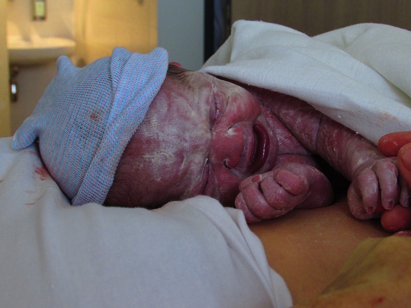 Omdat dochter Zoë een betere start had dan verwacht, werd ze direct na de geboorte bij moeder op de borst gelegd. “Ze ademde zelfstandig, dat was een enorme geruststelling. Maar dat ik haar direct op de borst kreeg, had ik niet verwacht. Dat voelde heerlijk, direct heel vertrouwd. Maar omdat ik een ruggenprik had gehad, kon ik niet mee om haar weg te brengen naar de couveuse-afdeling. En daarom vroegen ze aan Martijn om zijn borst te ontbloten voor het buidelen. In een rolstoel werd Martijn met Zoë op zijn borst vervoerd naar de couveuse-afdeling. We waren zo blij dat hij dit voor haar kon doen. Je merkte ook meteen dat ze hierdoor heel rustig bleef.”