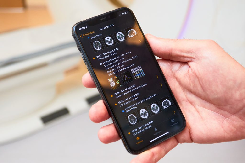 “Hoe eerder we die behandeling kunnen beginnen, hoe groter de kans op herstel voor de patiënt”, zegt Hendriks. Met de nieuwe software kunnen de betrokken specialisten via een beveiligde app op hun telefoon bijna realtime de CT-beelden die in het Catharina Ziekenhuis zijn gemaakt, beoordelen. “Deze software stuurt ons direct de juiste beelden door en geeft ons een uitkomst: wel of geen afsluiting en waar deze afsluiting zich bevindt. Via de app praat ik met de dienstdoende neuroloog die naar diezelfde beelden kijkt. Zo kunnen we samen – waar we ons ook bevinden – in één minuut beoordelen of de patiënt in aanmerking komt voor een IAT-behandeling”, zegt Hendriks.