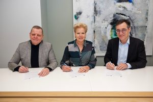 De meerjarenovereenkomst wordt ondertekend door (v.l.n.r. op de foto) Nardo van der Meer (voorzitter RvB Catharina Ziekenhuis), Geranne Engwirda (lid RvB Catharina Ziekenhuis) en Cas Ceulen (Chief Health Officer bij Coöperatie VGZ).