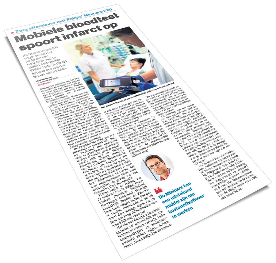 Philips lanceerde in mei 2016 de Minicare I-20-troponinetest. Het instrument voor snelle diagnosticering van een hartinfarct aan het bed is getest in het Catharina Ziekenhuis in Eindhoven. Klinisch chemicus prof. dr. Scharnhorst van het Catharina Ziekenhuis: “De Minicare is een platform waarmee straks aan de hand van een klein druppeltje bloed veel verschillende testen uitgevoerd kunnen worden.”