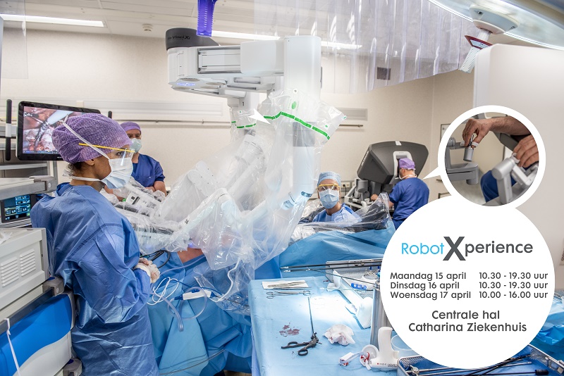 Het Catharina Ziekenhuis opereert sinds kort met de allernieuwste operatierobot. En nu zoekt het tijdelijke robotchirurgen. Op maandag 15, dinsdag 16 en woensdag 17 april houdt het ziekenhuis de RobotXperience. In de centrale hal van het ziekenhuis kunnen bezoekers en patiënten zelf achter de allernieuwste operatierobot ervaren hoe het is om een chirurg te zijn.