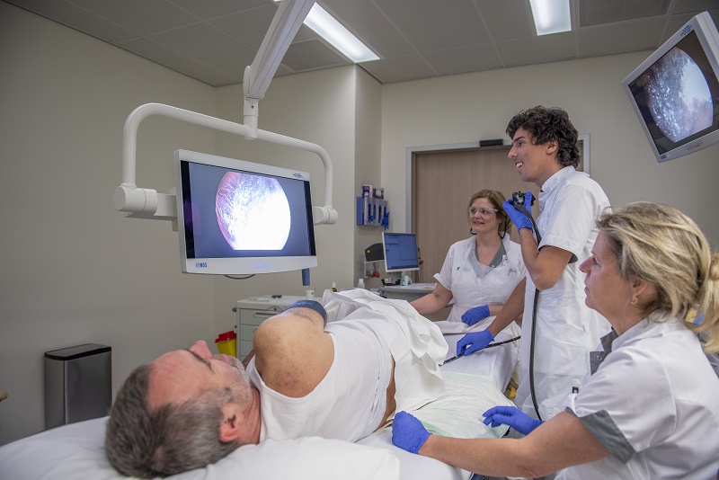 Een half uur voor het darmonderzoek meldt de patiënt zich in het ziekenhuis en wordt hij/zij gereed gemaakt voor het onderzoek “Patiënten krijgen een roesje. Soms worden zij halverwege het onderzoek lichtelijk wakker en kunnen zij meekijken op het scherm. Soms stellen patiënten dan vragen, maar zij kunnen zich dit na afloop vaak niet herinneren, omdat het middel dat is toegediend ervoor zorgt dat zij vergeten wat er is gebeurd”, legt Schreuder uit.