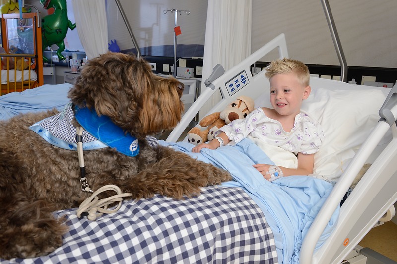 Opgenomen worden in het ziekenhuis is natuurlijk niet altijd een pretje. De labradoodles van onze vrijwilligers maken het verblijf van onze patiënten een stukje aangenamer. En meer dan dat: Teun, Sydney en hun collega’s van de Bezoekhondenservice geven rust, afleiding én troost.