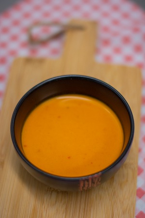 Bereiding: Verhit de olie in de pan en voeg de rode curry pasta toe. Voeg de gepelde tomaten toe en roer door. Meng in een aparte kom of maatbeker het kokospoeder met water. En voeg aan de rest toe en verwarm dit in de pan. Voeg de bouillonpasta of tablet toe. Bind de soep met maïzena en voeg op het laatste de room toe.