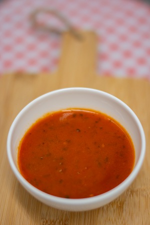 Ingrediënten: Ingrediënten: – 1 liter zonnebloem olie – 3 rode pepers Bereiding: Pureer met een staafmixer de rode peper in de olie. Zeef de gepureerde olie met een fijne bol zeef. Indien een mildere smaak gewenst is: Blancheer de rode peper kort (± 10 seconden) in kokend water en koel daarna meteen terug in ijswater. Knijp de rode peper uit en voeg toe aan de olie. Pureer met een staafmixer de rode peper in de olie. Zeef de gepureerde olie met een fijne bol zeef.