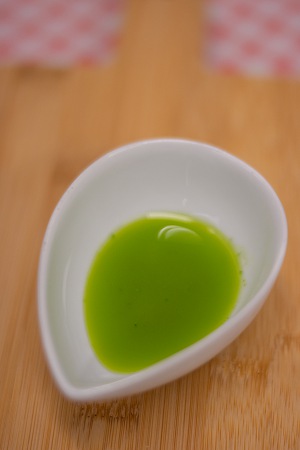 Bereiding: Blancheer de basilicum kort (± 10 seconden) in kokend water en koel daarna meteen terug in ijswater. Knijp de basilicum uit en voeg toe aan de olie. Pureer met een staafmixer de basilicum in de olie. Zeef de gepureerde olie met een fijne bolzeef.