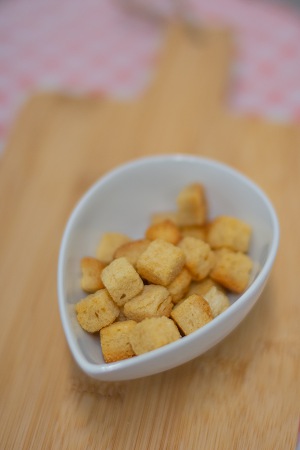 Bereiding: Verwarm de oven voor op 170 °C. Casino brood licht aanvriezen. Snijd vervolgens in blokjes van 0.5 cm bij 0.5 cm. Besmeer de blokjes brood met olijfolie en knoflook. Rooster ze in de oven gedurende 6 minuten.