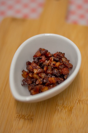 Bereiding: Snijd de ontbijtspek in kleine blokjes. Bak deze in een droge pan tot dat ze krokant en bruin zijn.