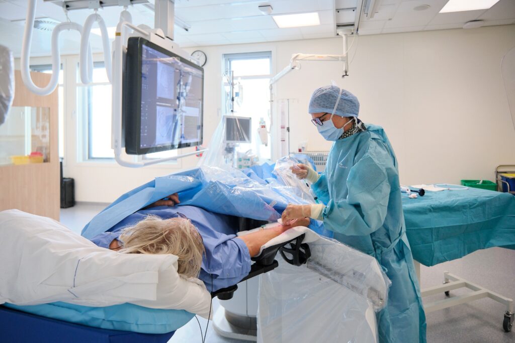Hij is nog maar amper binnen of Willibrord ligt al op de operatietafel. Annemiek de Vos zal de ingreep uitvoeren en knoopt direct een gesprekje met hem aan. De Vos is interventiecardioloog en staat aan het hoofd van een team dat werkt als een geoliede machine. „Dat moet ook wel, want gemiddeld krijgen we dagelijks zeven of acht patiënten op de tafel. We werken met een vaste ploeg. Dat is handig, want zo weten we precies wat we aan elkaar hebben.”