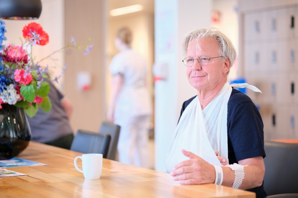 De wond in zijn pols wordt met een speciale luchtpleister dichtgeplakt. „Deze moet u een paar uur laten zitten, meneer. In de Hartlounge helpen ze u verder. Tot ziens en het gaat u goed.”