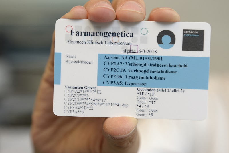 Aan de hand van een buisje bloed- of speeksel wordt in het laboratorium een zogenoemd DNA-paspoort opgesteld. Op zo’n kaartje staat het farmacogenetisch profiel dat aangeeft hoe het lichaam reageert op verschillende medicijnen. “Op grond daarvan kan een specialist beter persoonlijk gerichte medicijntherapie voorschrijven. Zo kan de dosering worden verhoogd of verlaagd of moet er juist een alternatief middel worden voorgeschreven”. “We werken hierin nauw samen met de apotheek.”
