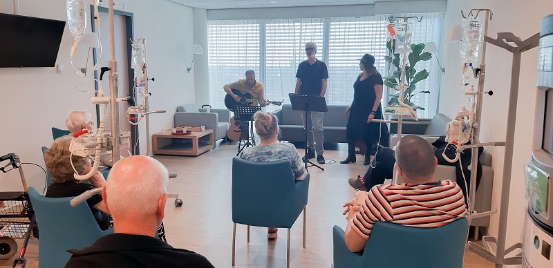 Maar het is geen festival, dit is zoals gezegd het dagverblijf van de afdeling Oncologie waar een aantal patiënten is aangeschoven voor een langverwacht verzetje. Organisator Romy van Limpt, als verpleegkundige dagelijks druk met patiëntenzorg, legt uit: “Op de afdeling Oncologie vroegen we ons af wat we naast de normale zorg nog meer konden doen voor onze patiënten. Complementaire zorg, noemen we dat.” Omdat Romy van Limpt zelf uit een muzikale familie komt opperde ze om akoestische mini-concerten te organiseren. “Muziek heeft een positieve uitwerking op lichaam en geest en het is echt iets waar meer mensen tegelijk aan kunnen deelnemen.”