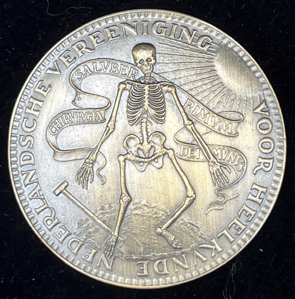 De gouden legpenning laat twee oude, maar nog altijd relevante symbolen aan beide zijden zien. Rutten: “Aan de voorkant is een skelet te zien, symbool voor onze eindigheid onder de zon, met de tekst: ‘chirurgia salaber rimvm dei mvnvs’ wat zoveel betekent als ‘de heilzame geneeskunde is de voornaamste opdracht van God’. Dit verwijst ongetwijfeld naar de nog veel oudere eed van Hippocrates, waarin de arts belooft om de geneeskunde alleen toe te passen om de zieken beter te maken. Tegenwoordig zou aan de heilzame geneeskunde ongetwijfeld het voorkomen en vroegtijdig opsporen van ziekte toegevoegd worden.”
