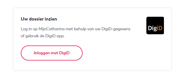Dit doet u via www.mijncatharina.nl. Vul uw DigiD-gebruikersnaam en -wachtwoord in, gevolgd door de code die u via een sms-bericht op uw mobiele telefoon ontvangt. Of gebruik de DigiD app. U krijgt dan toegang tot uw persoonlijke MijnCatharina-omgeving.