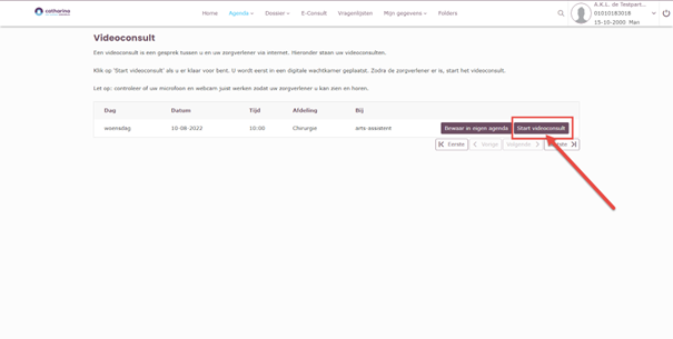 4) Is het videoconsult niet zichtbaar op de startpagina? Ga dan naar ‘Agenda’ en kies vervolgens in het uitklapmenu voor ‘Videconsult’.