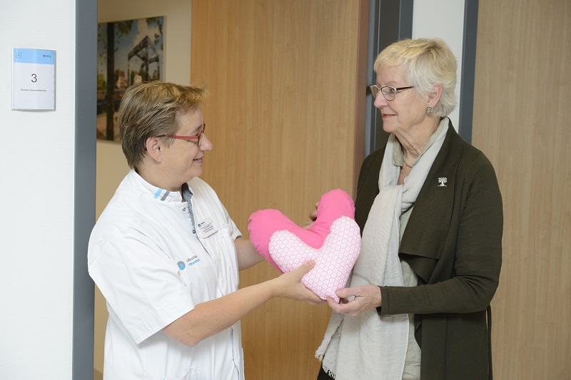Om de pijn van net geopereerde borstkankerpatiënten te verzachten, maken vrijwilligers van de vereniging Vrouwen van Nu speciale hartvormige kussens. Deze kussens versturen zij naar verschillende ziekenhuizen. Ook patiënten van ons Borstkankercentrum krijgen deze kussens.