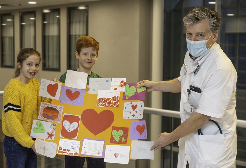 Hartverwarmend! Selah en Elias van Groep 8b van basisschool de Regenboog in Eindhoven kwamen vanmorgen naar het ziekenhuis om al het zorgpersoneel een hart onder de riem te steken in deze tweede coronagolf.