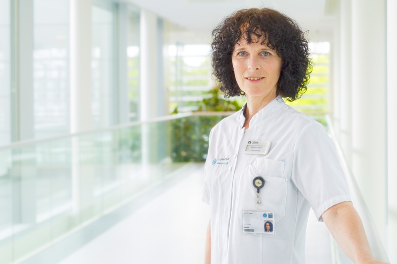 De ochtend begint vroeg in het Catharina Ziekenhuis. Caroline zit om 08.30 uur in de wachtkamer van de poli dermatologie samen met haar moeder te wachten op wat komen gaat. “Ik ben zo zenuwachtig. Niet zozeer voor de behandeling, maar hoe het eruit komt te zien. Het is toch in mijn gezicht. Als het op mijn rug zou hebben gezeten dan was het anders geweest. Ik vind het psychisch zwaar”, vertelt ze. De spanningen worden haar even teveel. Heel begrijpelijk. Dan is het tijd om te gaan. Nog even de bemoedigende armen van haar moeder en dan stapt ze dapper de operatiekamer binnen. Daar wordt ze opgevangen door dermatoloog dr. Monique Thissen die haar uitlegt wat ze gaat doen. “We gaan eerst het plekje op je neus aftekenen. Daarna zal ik je huid met en injectie plaatselijk verdoven. Vervolgens haal ik het plekje weg en gaat het naar de patholoog die gaat kijken of de snijvlakken schoon zijn. Is dit niet het geval dan moeten we in een tweede ronde opnieuw een stukje weefsel weghalen. Maar laten we hopen dat een tweede ronde niet nodig is.”