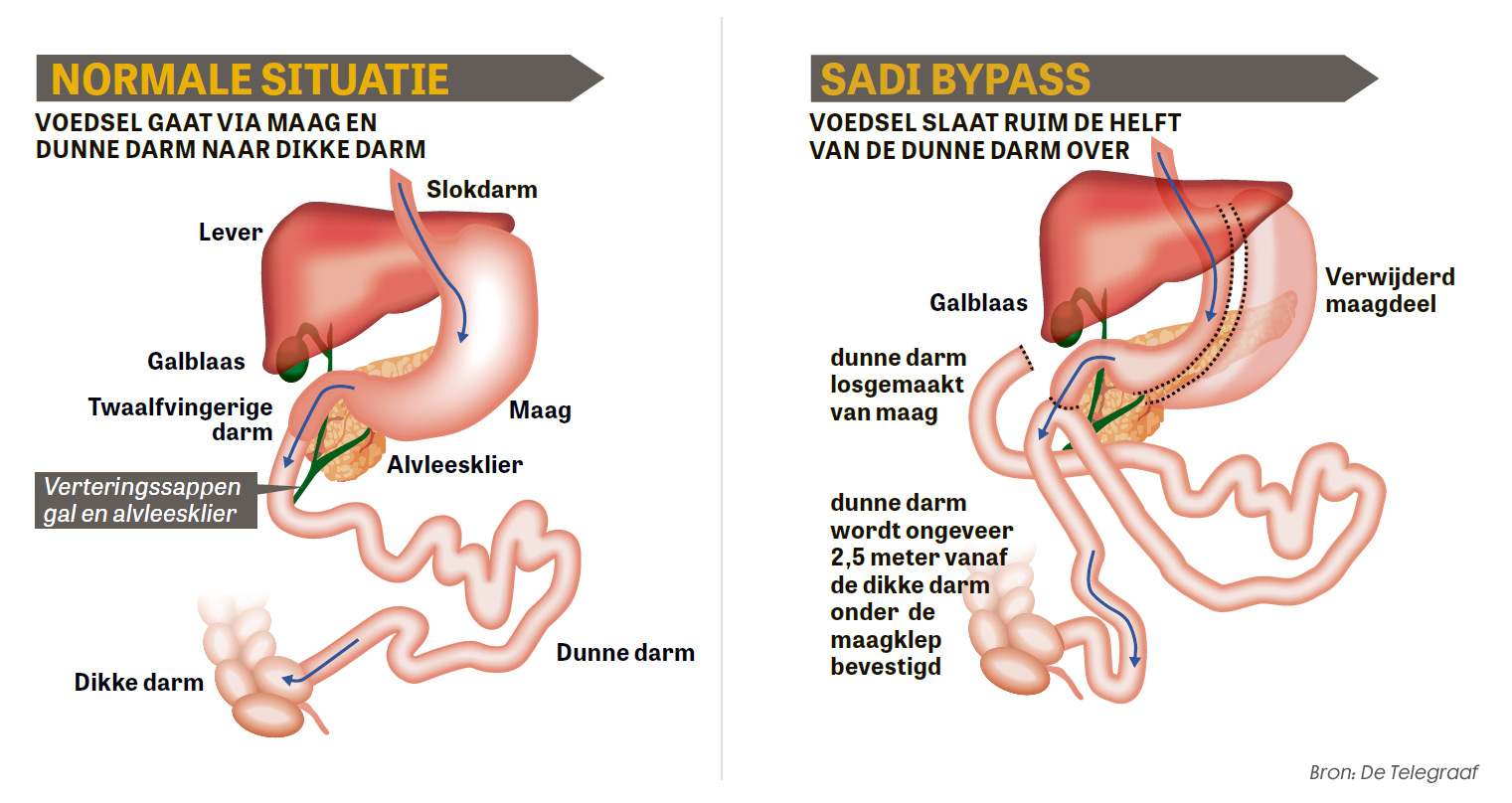 Het komt vaker voor dat bij mensen met een BMI hoger dan 55 een eerste operatie, altijd een gastric sleeve, niet voldoende is om de ontspoorde balans in het lichaam te herstellen. Het BMI van deze patiënten blijft dan toch nog steken boven de 40. Daar is nu de SADI-behandeling een oplossing voor. Bij de nu toegepaste SADI-behandeling (voluit ’Single Anastomosis Duodenal-Ileal bypass’) wordt net na de maagkringspier/ maagklep de darm doorgesneden om vervolgens verderop een verbinding te maken met de dunne darm. De maagklep blijft intact, waardoor de patiënt beter een gevoel van verzadiging behoudt. Voedsel legt door de chirurgische ’omleiding’ nog maar de helft van de weg door de darmen af, waardoor het lichaam veel minder voedingsstoffen kan opnemen. Na de operatie is het ook voor deze patiënten mogelijk om na verloop van tijd weer een BMI van tussen 30 en 35 te hebben. Nóg te hoog, maar zij zijn daarmee wel uit de gevarenzone. “Ik ga er alles aan doen om onder een BMI van 30 te komen. Ik ben het Catharina Ziekenhuis zo ontzettend dankbaar, ik krijg een ‘tweede’ kans en die pak ik met beide handen beet”, besluit Suzan haar verhaal.