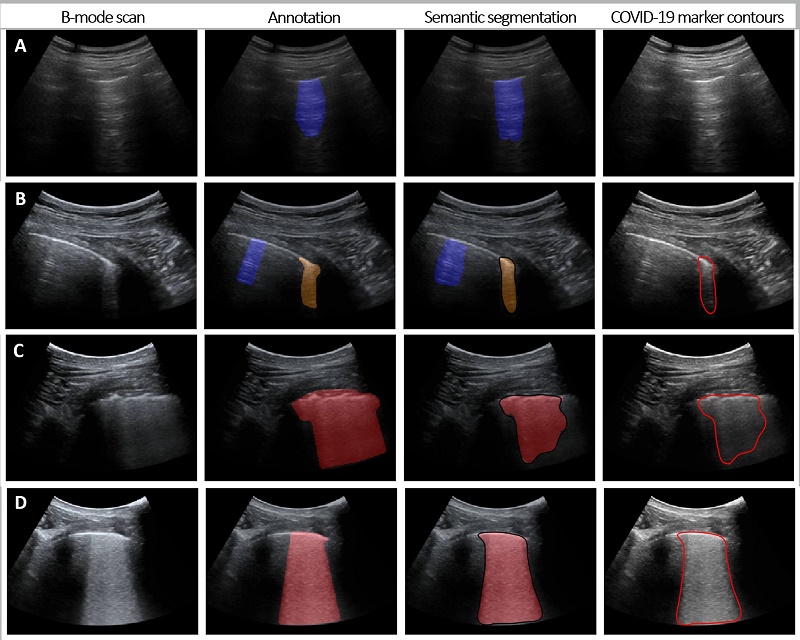 Column 1 and 2 show lung ultrasounds without and with annotated COVID-19 biomarkers (orange: moderate, red: severe). Columns 3 and 4 respectively show the semantic segmentations and contours of COVID-19 markers by means of deep learning analysis. Image: TU Eindhoven.