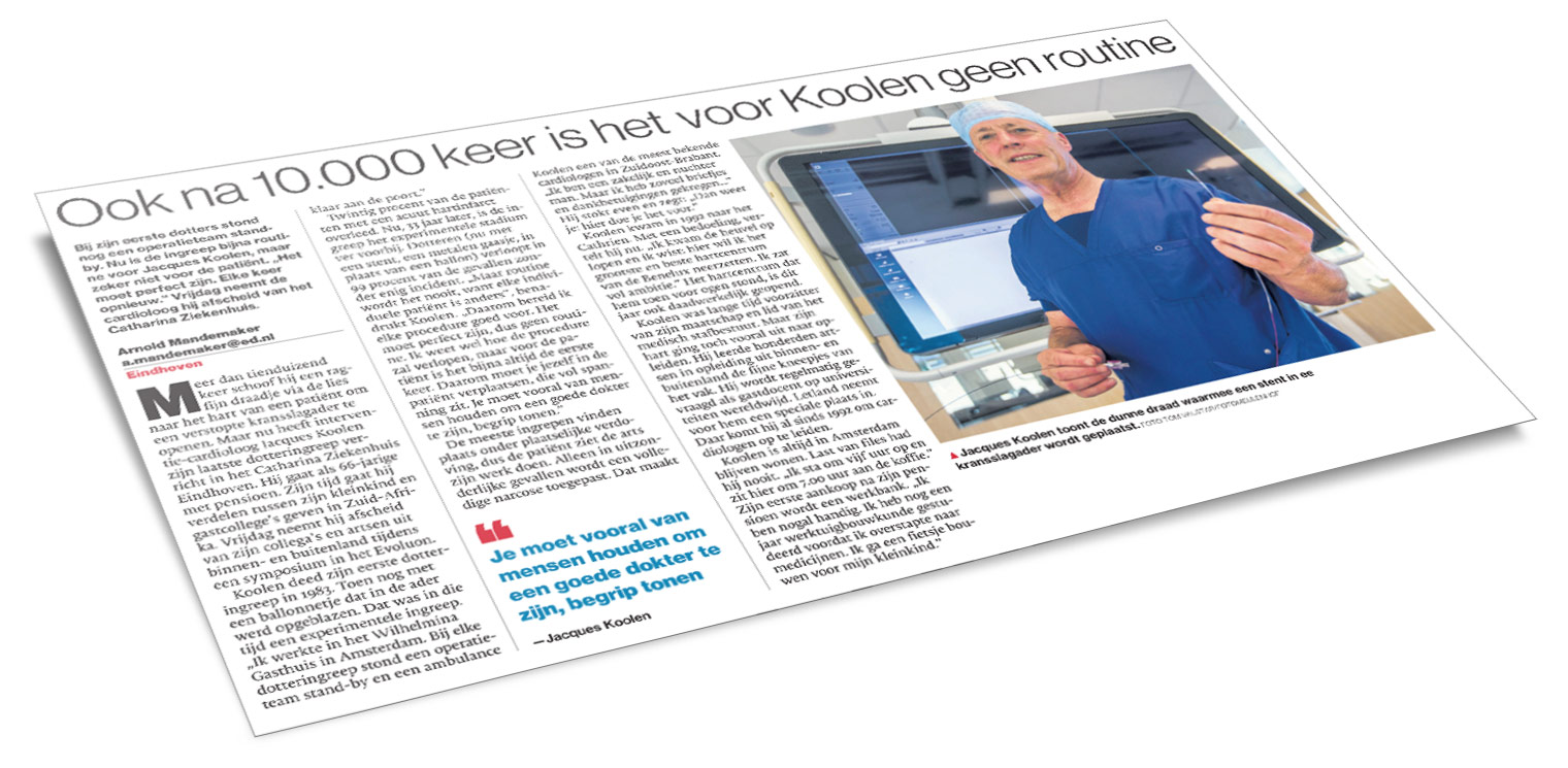 Vandaag neemt Koolen afscheid van zijn collega’s en artsen uit binnen- en buitenland tijdens een symposium in het Evoluon in Eindhoven. Het Eindhovens Dagblad interviewde de bevlogen cardioloog. “Ik bereid elke procedure goed voor. Het moet perfect zijn, dus geen routine. Ik weet wel hoe de procedure zal verlopen, maar voor de patiënt is het bijna altijd de eerste keer. Daarom moet je jezelf in de patiënt verplaatsen, die vol spanning zit. Je moet vooral van mensen houden om een goede dokter te zijn.”