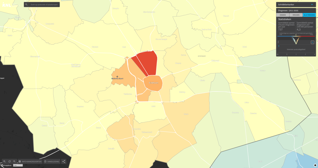 Wie de kankeratlas bekijkt, ziet dat ook schildklierkanker relatief veel voorkomt in Eindhoven. Dat is zeer waarschijnlijk toeval, zegt De Hingh. “Dat is een uiterst zeldzame vorm van kanker, die vooral bij jonge vrouwen voorkomt. Het totaal aantal nieuwe gevallen in een jaar ligt landelijk rond de 750. Met zulke relatief kleine getallen kan er makkelijk een uitschieter zijn, bijvoorbeeld omdat ergens in één wijk veel jonge vrouwen wonen.” Schildklierkanker is een ziekte die op relatief jonge leeftijd voorkomt. Twee keer zoveel vrouwen als mannen worden gediagnosticeerd met schildklierkanker.