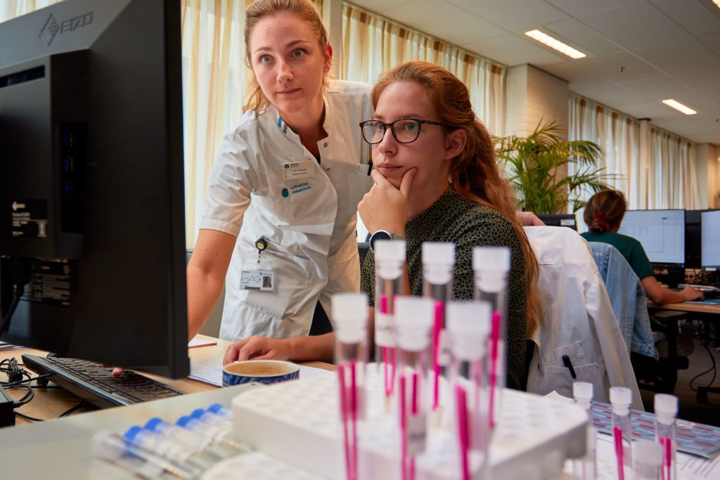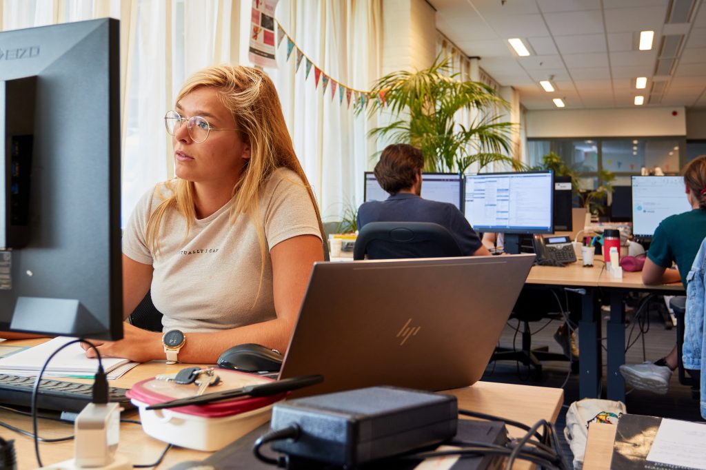 Arts-onderzoeker Radiotherapie Floor Piqeur (26) doet samen met drie collega’s onderzoek naar darmkanker. „Omdat we allemaal met hetzelfde onderwerp bezig zijn, krijg je meer diepgang. Door samen te werken krijg je andere inzichten waar je zelf niet zo bij stilstaat”, legt ze uit. „We geven elkaar directe feedback. Dat kan de manier waarop je naar het probleem kijkt, veranderen.”