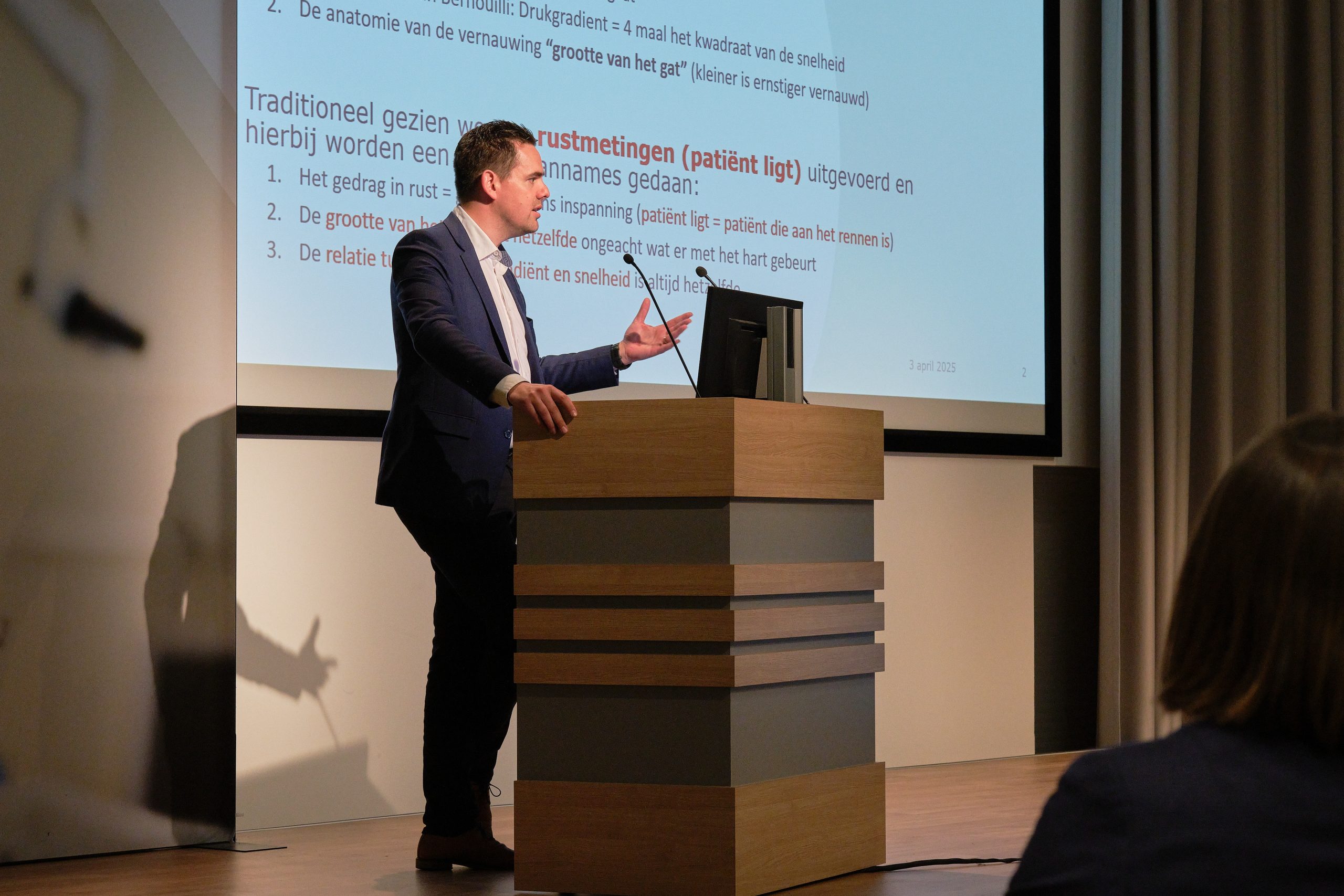 Er was ook ruimte om posters van een kleine twintig onderzoekers over hun onderzoek te bezichtigen. Rob Eerdekens won de prijs voor de beste posterpresentatie. Zijn onderzoek richt zich op het functioneren van een gezonde aortaklep onder stress. “Om te kunnen zeggen wat abnormaal is, moet je eerst weten wat normaal is”, vertelt Eerdekens.