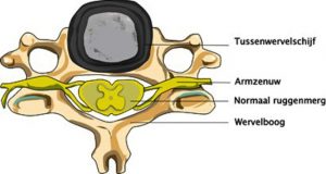 De halswervelkolom bestaat uit zeven wervels. In totaal zijn er 7 nek- (of cervicale) wervels C1 t/m C7. Met uitzondering van de twee bovenste wervels (C1 en C2), ligt er tussen twee opvolgende halswervels telkens een tussenwervelschijf. De schijf is elastisch en fungeert als een soort schokdemper. Bovendien zorgt de tussenwervelschijf ervoor dat de wervels enigszins ten opzichte van elkaar kunnen bewegen. Centraal in de tussenwervelschijf zit een kern (de nucleus) die bestaat uit een gelachtige massa. In geval van een hernia (ook wel hernia nucleus pulposi) is er sprake van een uitpuilende kern van de tussenwervelschijf die druk kan geven op een zenuw. Dit kan leiden tot uitstralende pijn en/of gevoelsstoornissen. Naarmate we ouder worden treedt er bovendien slijtage op en wordt de tussenwervelschijf smaller. Hierdoor neemt de schokdempende functie af. Ook kan de stand tussen wervels ten opzichte van elkaar veranderen waardoor een zenuw bekneld kan raken.