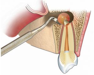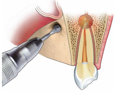 De behandeling gebeurt meestal met een plaatselijke verdoving. De verdoving is dezelfde als die bij de tandarts. Wanneer u tijdens de behandeling het gevoel heeft dat de verdoving onvoldoende is, moet u dit direct aangeven. Als de verdoving is ingewerkt, zal de arts een sneetje in het tandvlees maken en het tandvlees wat opzij schuiven. Vervolgens zal met een boortje wat ruimte gemaakt worden in het kaakbot om de ontsteking te kunnen bereiken. Het ontstekingsweefsel zal worden verwijderd en het puntje van de wortel zal met een boortje worden ingekort. De ingekorte wortel wordt afgesloten met een vulmateriaal. De wond wordt vervolgens gehecht.