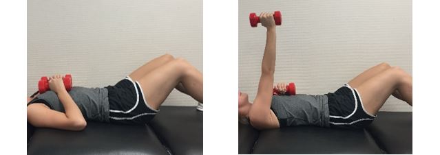 - Laat de arm weer gecontroleerd zakken richting het bed en buig hierbij de arm.