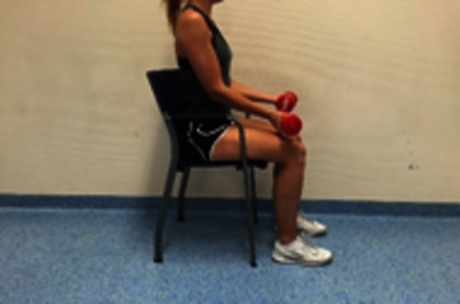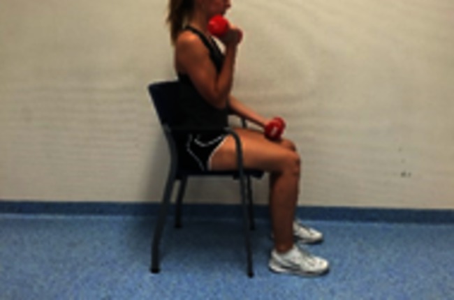 - Breng het gewichtje omhoog door de armen te buigen met de hand richting de schouder