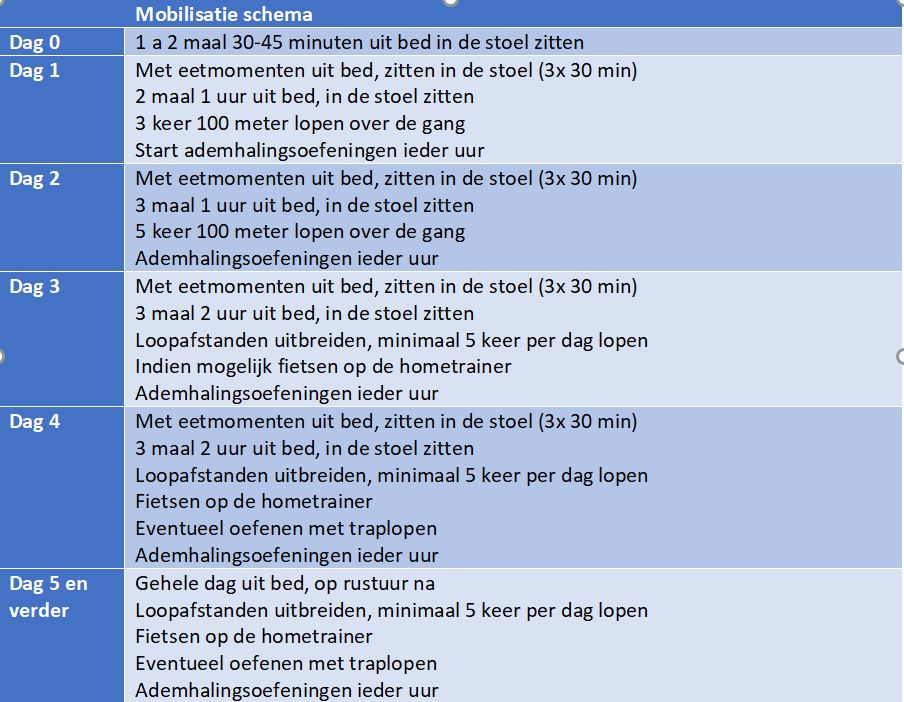 Na de operatie is het belangrijk dat u zo snel mogelijk gaat bewegen, de avond na de operatie helpen wij u op de Intensive Care al in de stoel. Dit breiden wij gedurende de opname steeds verder uit, de verpleegkundige en fysiotherapeut helpen u hierbij. Zie ook het schema hieronder: