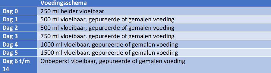 Het eten wordt na de operatie snel uitgebreid. De eerste 2 weken na de operatie zijn dit vloeibare producten waarin de hoeveelheid die u mag nuttigen iedere dag groter wordt. Eten dient u rechtop zittend aan tafel te doen. Indien u niet in staat bent om uit bed te komen, dient u zo veel mogelijk rechtop te zitten. Dit om de kans op verslikking te voorkomen en om uw lichaam te helpen het eten te verteren. Het advies is om na de operaties kleine beetje verdeeld over de dag te eten. De diëtiste observeert de intake tijdens de opname en geeft u ook adviezen voor thuis. Om alles ook goed te laten genezen, starten wij na de operatie met een opbouwschema eten en drinken, zoals hieronder: