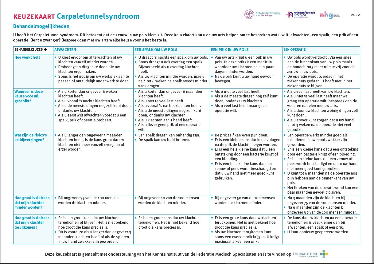 De keuzekaart ‘carpaletunnelsyndroom’ kan u helpen om samen met uw arts te beslissen welke behandeling het beste bij u past. Kijk vooraf aan de afspraak naar de keuzekaart en schrijf eventuele vragen voor de arts op.