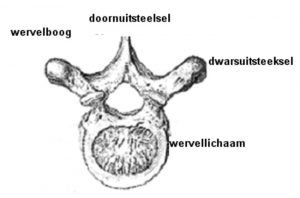 In figuur 1 ziet u hoe de rug, ofwel de wervelkolom, is opgebouwd. Deze bestaat doorgaans uit 7 nekwervels (C1 t/m C7), 12 borstwervels (Th1 t/m Th12), 5 lendenwervels (L1 t/m L5) en 5 heiligbeenwervels (S1-S5) en het staartbeen (os coccygis). In figuur 2 ziet u een dwarsdoorsnede van een (lenden)wervel.
