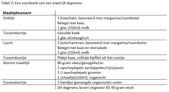 Als u meer inzicht wilt krijgen in de hoeveelheid eiwit in uw eetpatroon dan kunt u de voeding berekenen via de app ‘Mijn Eetmeter’ van het Voedingscentrum: https://mijn.voedingscentrum.nl/nl/eetmeter/