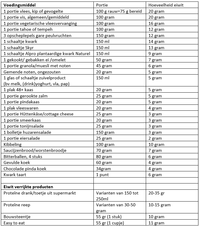 Onderstaande tabel geeft weer hoeveel gram eiwit diverse producten bevatten. De producten zijn geselecteerd op hun eiwitgehalte en niet op basis van de voorkeurstabel van de schijf van vijf.
