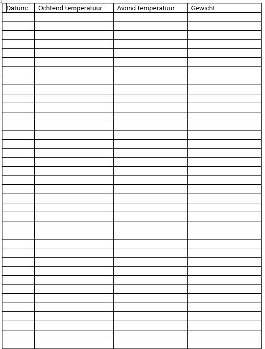 - dagelijks uw gewicht controleert. Deze metingen kunt u in het schema achterin de folder noteren;