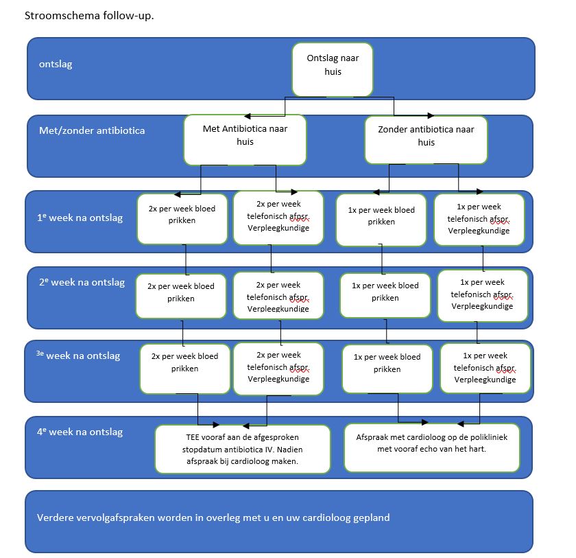 Als uw antibioticabehandeling thuis beëindigd is, bezoekt de wijkverpleegkundige u nog één keer. De cardioloog bespreekt met u of verdere behandeling of extra controle noodzakelijk is. Als dit niet het geval is, kunt u uw activiteiten langzamerhand weer uitbreiden.