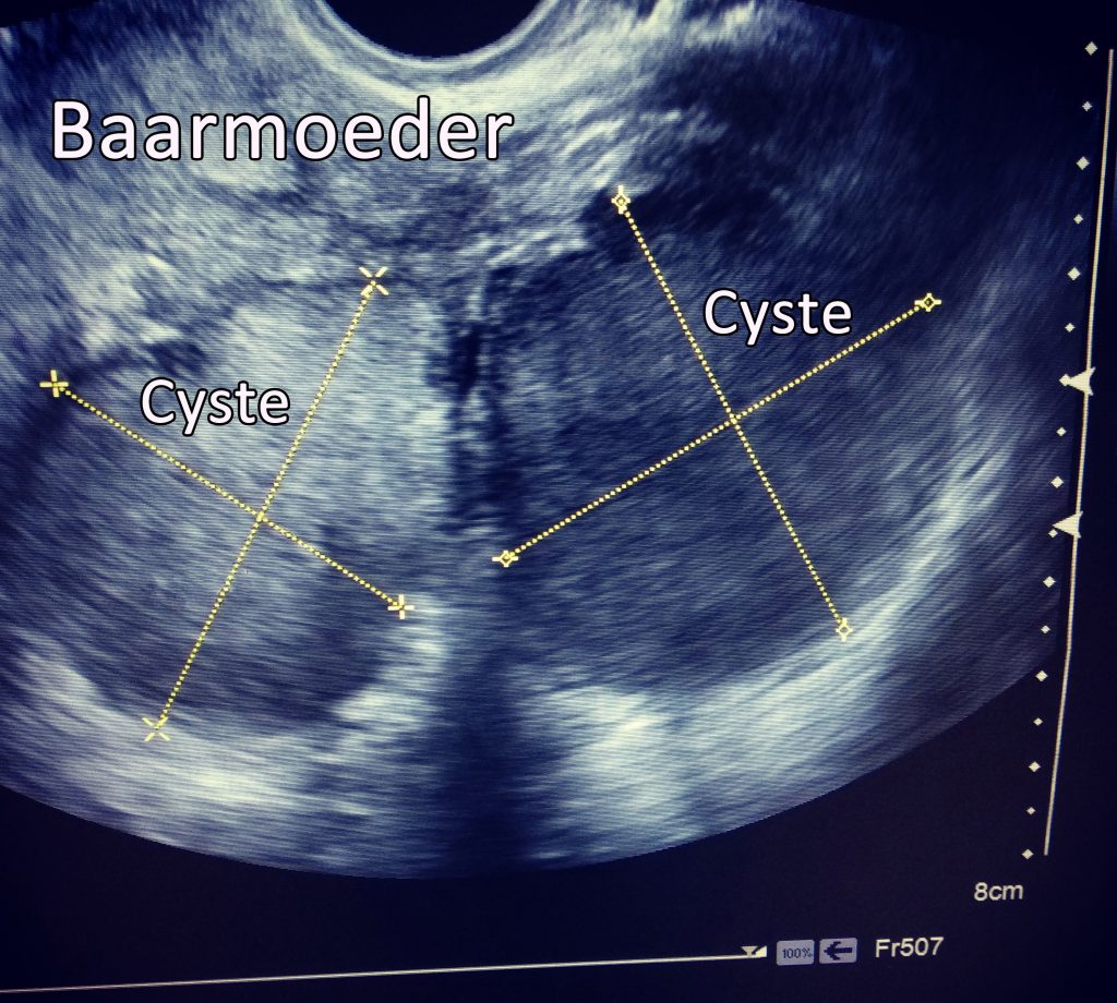 Lichte endometriose is soms niet te zien bij een inwendig echoscopisch onderzoek. Een ernstige vorm soms wel, vooral als het slijmvlies in de eierstokken zit (zie figuur 2).