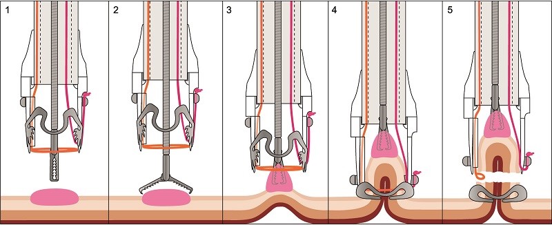 Een eFTR kan worden toegepast bij een afwijking tot ongeveer twee centimeter groot. Hierbij wordt niet alleen de afwijking, maar ook de darmwand hieronder verwijderd. Met een paktang wordt de afwijking geleidelijk in een huls getrokken. Vervolgens wordt er eerst een klem aangebracht onder de afwijking, waarna de afwijking net boven de klem wordt doorgesneden. Het gat (perforatie) dat zo in de darmwand ontstaat is dus al afgesloten, voordat het is losgesneden. Het klemmetje laat op den duur los als de darmwand is genezen en gaat via de ontlasting mee naar buiten. U merkt hier niets van.