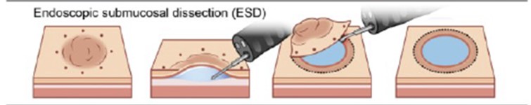 Schematische weergave van opeenvolgende stappen van de Endoscopische Submucosale Dissectie. Van links naar rechts:
