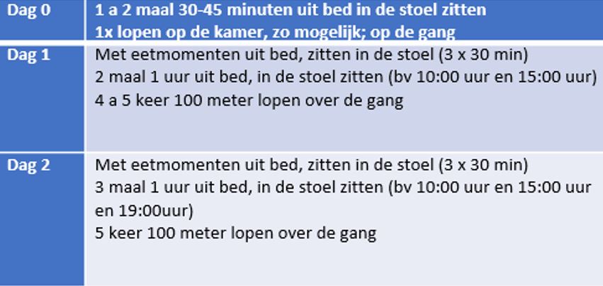 Na de operatie is het belangrijk dat u zo snel mogelijk gaat bewegen. Doordat u in principe maar 1 dag/ nacht opgenomen zult zijn is het van belang dit thuis door te zetten. Zie ook het schema hieronder.